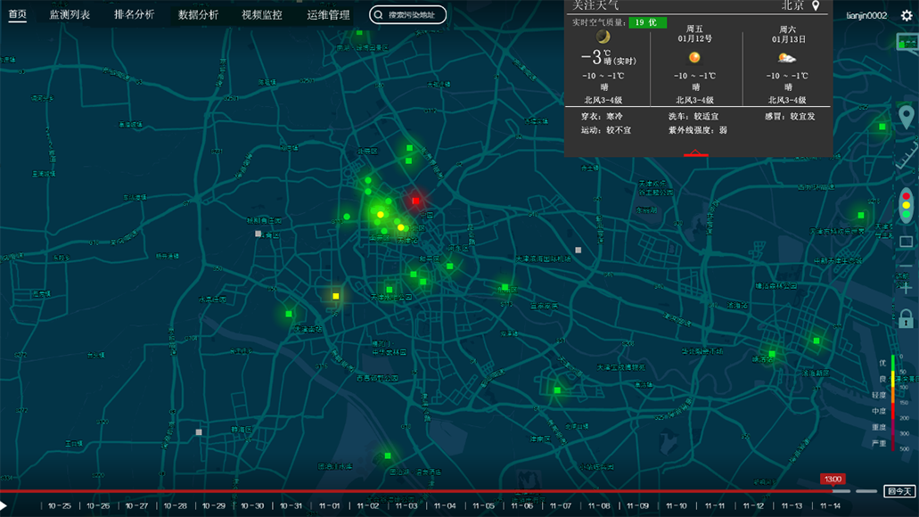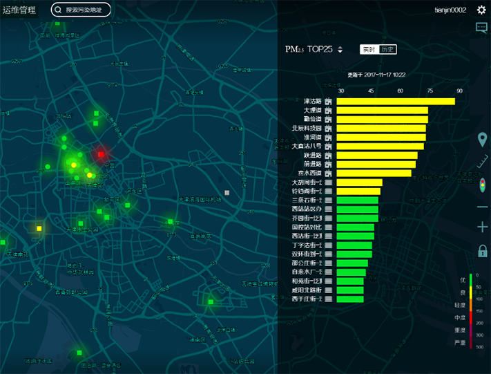 1. 當(dāng)前為各個點位的PM2.5或者PM10整體分布??梢钥吹礁鱾€檢測點位的相對位置,可以通過放大或者縮小查看點位的具體分布情況。