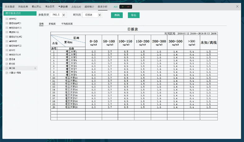 可以對特定的點位按選定的時間段進行超標(biāo)統(tǒng)計,以表和圖兩種方式同時顯示。通過圖可以直觀地看到超標(biāo)的情況,通過表可以詳細(xì)查看什么時間出現(xiàn)的超標(biāo)。