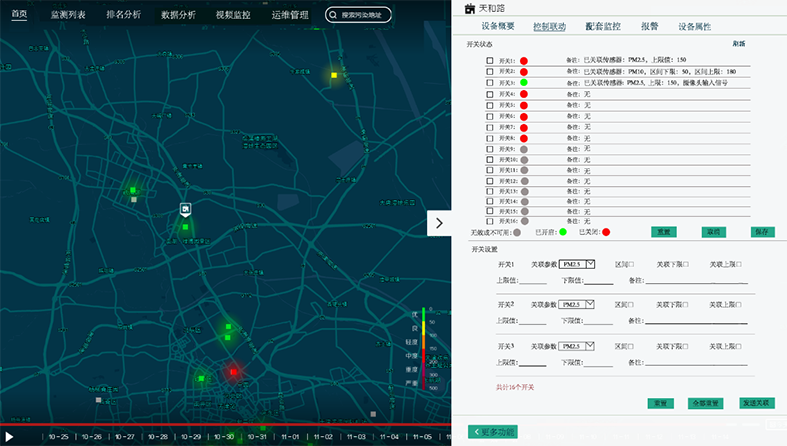 設(shè)備帶有繼電器,可以和設(shè)備檢測到的數(shù)據(jù)進行關(guān)聯(lián),可選手動或自動啟動。例如,揚塵超標(biāo)噴淋等。