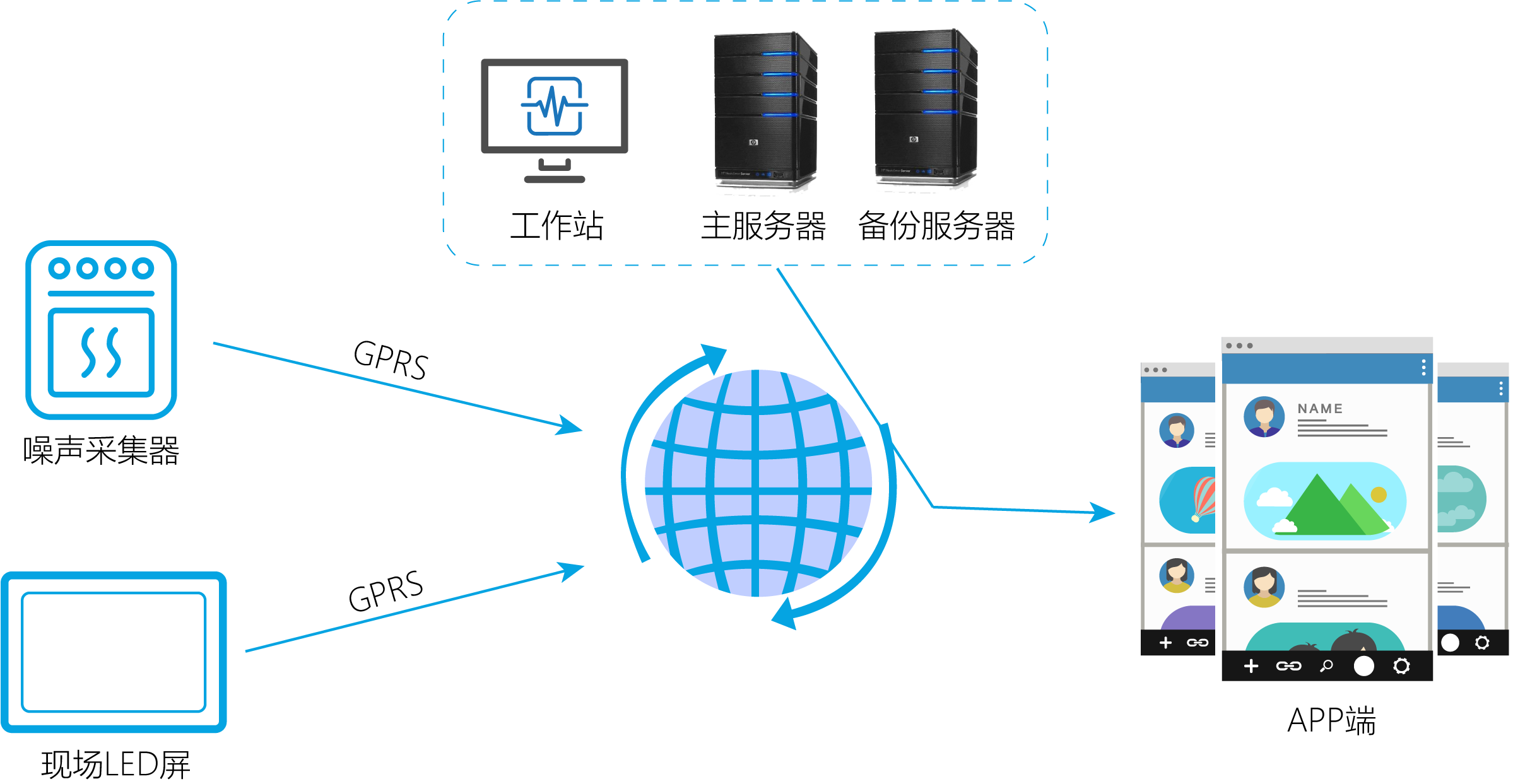 各噪聲數(shù)據(jù)采集點布設(shè)的環(huán)境復(fù)雜、網(wǎng)點分散,我們采用無線傳輸方式(避免用有線布線浪費人力物力的情況),在智能監(jiān)控終端內(nèi)加無線GPRS/CDMA模塊,再通過內(nèi)插一張GPRS流量卡自動撥號后作為數(shù)據(jù)傳輸通道,并實現(xiàn)24小時永遠(yuǎn)在線、實時監(jiān)控的目的。