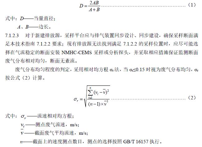 7.1.2.2 測定位置應(yīng)避開煙道彎頭和斷面急劇變化的部位。對于流速連續(xù)監(jiān)測系統(tǒng),應(yīng)設(shè)置在距彎頭、閥門、變徑管下游方向≥4倍煙道直徑,以及距上述部件上游方向≥2倍煙道直徑處;對于NMHC-CEMS,應(yīng)設(shè)置在距彎頭、閥門、變徑管下游方向≥2倍煙道直徑,以及距上述部件上游方向≥0.5倍煙道直徑處。對矩形煙道,其當量直徑按公式(1)計算。