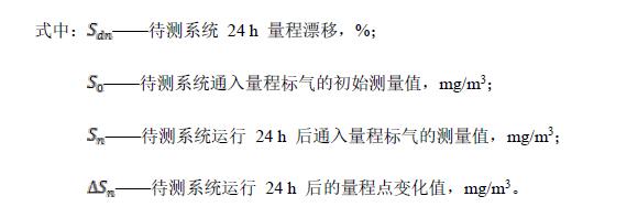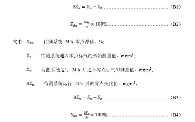 待測系統(tǒng)運行穩(wěn)定后,通入零點氣體,記錄零點穩(wěn)定讀數(shù)為Z0,然后通入量程標氣,記錄穩(wěn)定讀數(shù)S0。通氣結(jié)束后,待測系統(tǒng)連續(xù)運行24 h(期間不允許任何校準和維護)后分別通入同一濃度零點氣體和量程標氣重復上述操作,并分別記錄穩(wěn)定后讀數(shù)。按公式(B1)、(B2)、(B3)、(B4)計算待測系統(tǒng)24 h零點漂移Zd和24h量程漂移Sd,然后可對待測系統(tǒng)進行零點和量程校準(如果不校準可將本次零點和量程測量值作為CEMS 運行24 h 后零點和量程漂移測試的初始值Z0和S0)。重復上述測試3次。