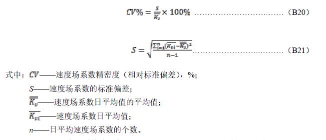 B.6.1每天至少獲得5個有效速度場系數(shù),計算速度場系數(shù)日平均值。但必須報告所有的數(shù)據(jù),包括舍去的數(shù)據(jù)。至少連續(xù)獲得3d的日平均值,并按式(B20)、(B21)計算速度場系數(shù)精密度: