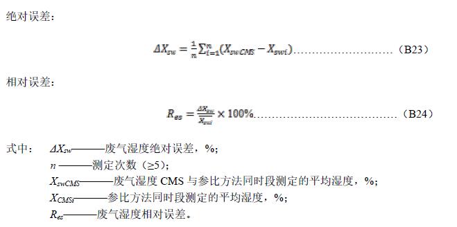B.8.2 取參比方法與CMS同時段測定值組成一個數(shù)據(jù)對,每天至少取5對有效數(shù)據(jù)用于相對準確度計算,但應(yīng)報告所有的數(shù)據(jù),包括舍去的數(shù)據(jù)對,連續(xù)進行3d。并按公式(B23)和(B24)計算廢氣濕度絕對誤差和相對誤差: